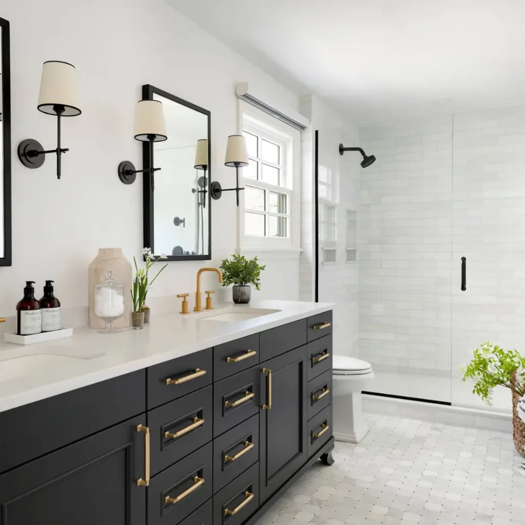 Upgrade your bathroom with new vanities, light fixtures, flooring, and fresh caulking.